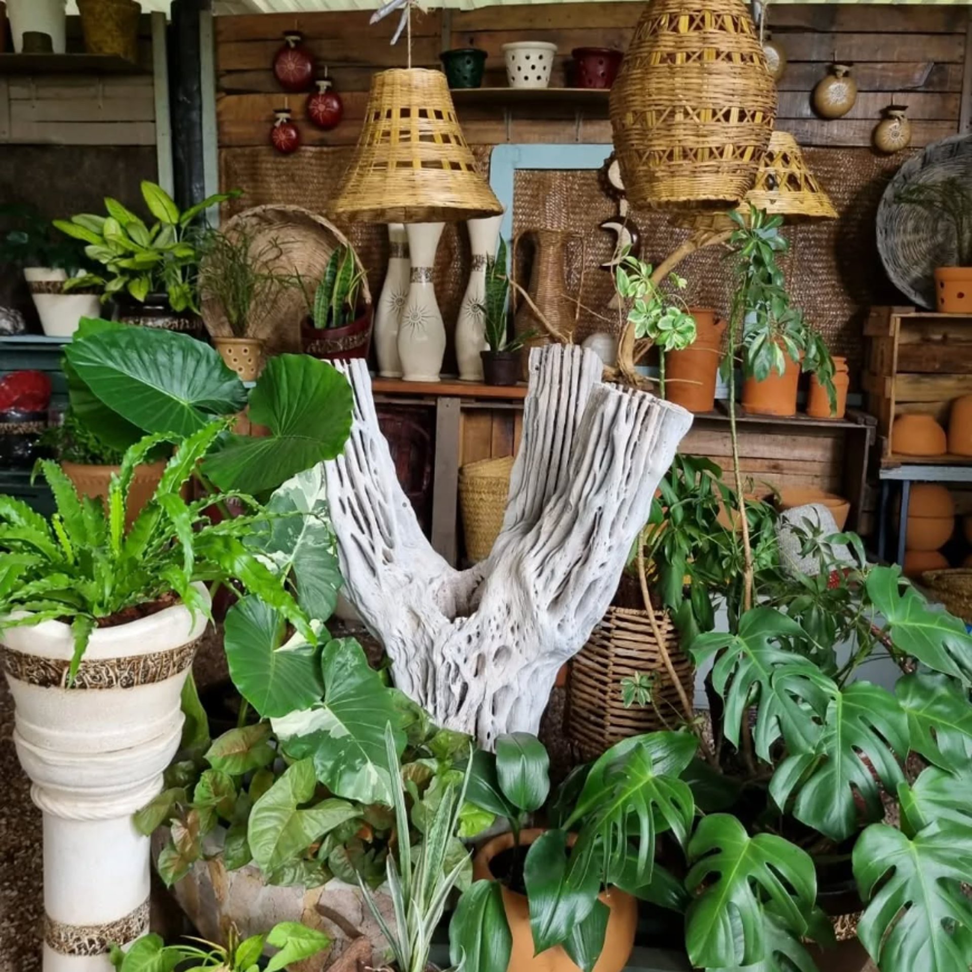 Amplia variedad de plantas y macetas de barro artesanales.